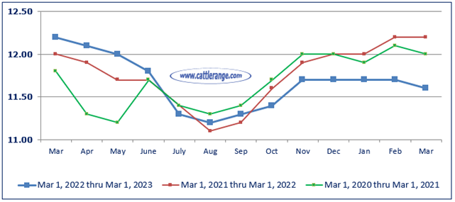 Cattle and calves on feed for the slaughter market in the United States for feedlots with capacity of 1,000 or more head totaled 11.6 million head on March 1, 2023. The inventory was 4 percent below March 1, 2022.