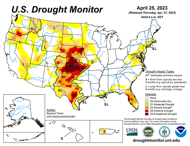 As of April 25, 2023, 21.37% of the U.S. and Puerto Rico and 25.55% of the lower 48 states are in drought, according to the U.S. Drought Monitor.