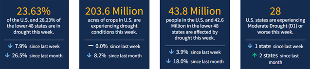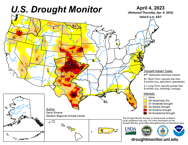As of April 4, 2023, 23.63% of the U.S. and Puerto Rico and 28.23% of the lower 48 states are in drought, according to the U.S. Drought Monitor.