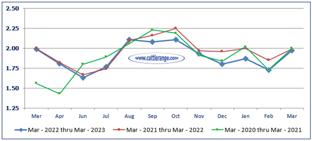 Marketings of fed cattle during March totaled 1.98 million head, 1 percent below 2022.