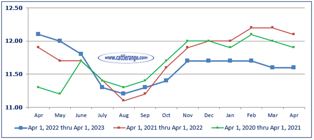 Cattle and calves on feed for the slaughter market in the United States for feedlots with capacity of 1,000 or more head totaled 11.6 million head on April 1, 2023. The inventory was 4 percent below April 1, 2022. The inventory included 7.12 million steers and steer calves, down 6 percent from the previous year. This group accounted for 61 percent of the total inventory. Heifers and heifer calves accounted for 4.50 million head, down 2 percent from 2022.