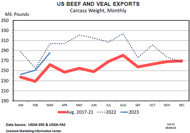 USDA ERS released March trade statistics which finalized data for the first quarter of 2023. Beef exports totaled 779.0 million pounds for the first quarter of the year, down 7.9% or 66.7 million pounds from the same period last year.