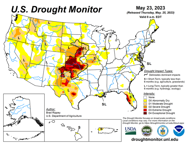 As of May 23, 2023, 16.05% of the U.S. and Puerto Rico and 19.20% of the lower 48 states are in drought, according to the U.S. Drought Monitor.