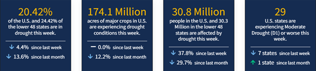As of May 2, 2023, 20.42% of the U.S. and Puerto Rico and 24.42% of the lower 48 states are in drought, according to the U.S. Drought Monitor.