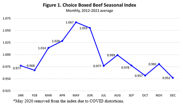 Boxed beef prices typically peak in May with wholesale buying ahead of summer grilling season, before dropping lower in the second half of the year. The seasonal pattern of boxed beef prices reflects the net impact of seasonal demands for the various beef products that are included in the boxed beef price as reported by the Agricultural Marketing Service (USDA-AMS). Current daily boxed beef reports include prices for more than 40 different beef cuts and subprimals. The price seasonality of each of these products varies according to the different uses of the products and the alternative supply chains in which they are mostly marketed. Beef products may flow primarily through the supply chains of retail grocery, food service (including restaurants) or export markets. Nearly all of the reported wholesale beef prices are currently higher year over year.