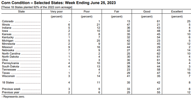 50% of Corn Crop rated as Good to Excellent Condition compared to 55% last week and 67% last year...