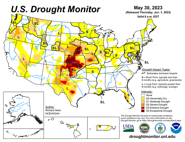 As of May 30, 2023, 15.84% of the U.S. and Puerto Rico and 18.95% of the lower 48 states are in drought, according to the U.S. Drought Monitor.