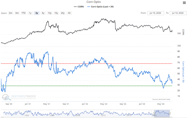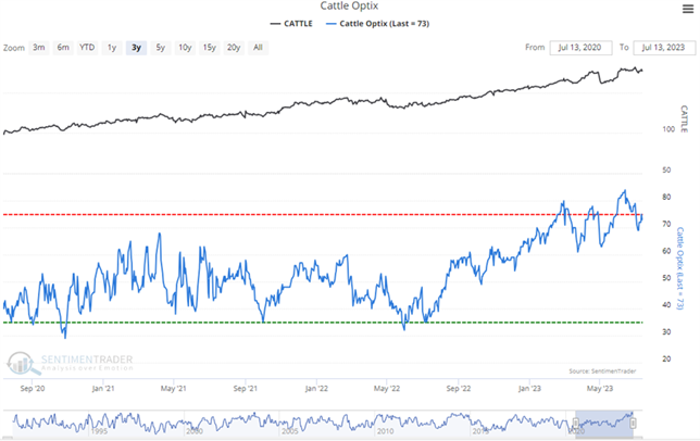 So when Public Opinion moves above the red dotted line in the chart, it means that compared to other readings over the past year, you're seeing excessive optimism. You also want to look at the absolute level of Opinion, too - if it's at 90%, then there's no question we're seeing an historic level of bullish opinion. Watch for readings above 80% (or especially 90%) to spot those dangerous times when the public is overly enthusiastic about a commodity.