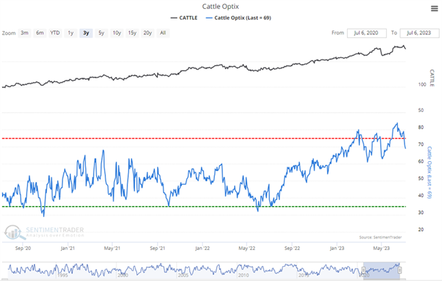 So when Public Opinion moves above the red dotted line in the chart, it means that compared to other readings over the past year, you're seeing excessive optimism. You also want to look at the absolute level of Opinion, too - if it's at 90%, then there's no question we're seeing an historic level of bullish opinion. Watch for readings above 80% (or especially 90%) to spot those dangerous times when the public is overly enthusiastic about a commodity.