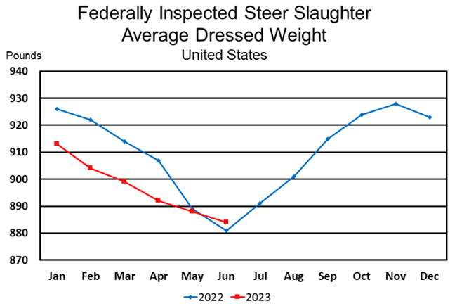 Beef production, at 2.33 billion pounds, was 5 percent below the previous year. Cattle slaughter totaled 2.89 million head, down 5 percent from June 2022. The average live weight was down 1 pound from the previous year, at 1,338 pounds.