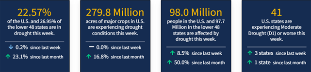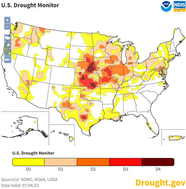 As of July 4, 2023, 22.57% of the U.S. and Puerto Rico and 26.95% of the lower 48 states are in drought, according to the U.S. Drought Monitor.