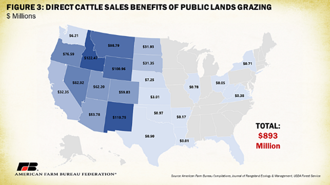 Figure 3 break, down these direct estimations further. Figure 3 displays the value of cattle sales attributed to public lands forage. Close to 90% of the estimated total livestock value, or $893 million, is linked to cattle production. Idaho ($122 million), New Mexico ($119 million) and Wyoming ($100 million) are the top public lands cattle states. These direct sales values contribute to the income basis for thousands of rural families in these states. Economic modeling specific to Idaho, Oregon and Nevada showed the loss of 5,389 active grazing permits resulted in an average 60% decline in cattle sales, 50% decline in labor income, a 65% decline in personal income (from $33,940 to $11,812), per operation, and billions in downstream economic losses. Additionally, the tax revenue received on these sales supports public safety, education and infrastructure in locations that are often already underserved and don’t otherwise receive tax revenue from federally-owned land.