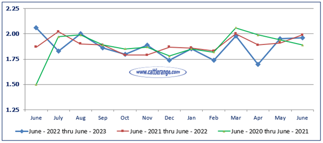 Marketings of fed cattle during June totaled 1.96 million head, 5 percent below 2022.