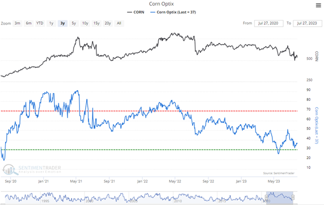 Conversely, when Public Opinion moves below the green dotted line, then the public is excessively pessimistic about the commodity's prospects for further gains compared to their opinion over the past year. Looking for absolute readings under 20% (or especially 10%) often indicates an upturn in the market.