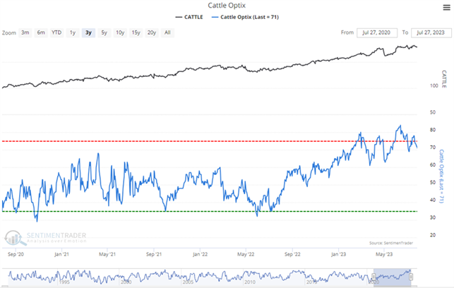 So when Public Opinion moves above the red dotted line in the chart, it means that compared to other readings over the past year, you're seeing excessive optimism. You also want to look at the absolute level of Opinion, too - if it's at 90%, then there's no question we're seeing an historic level of bullish opinion. Watch for readings above 80% (or especially 90%) to spot those dangerous times when the public is overly enthusiastic about a commodity.