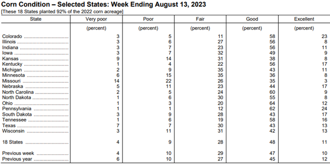 59% of Corn Crop rated as Good to Excellent Condition compared to 57% last week and 57% last year.