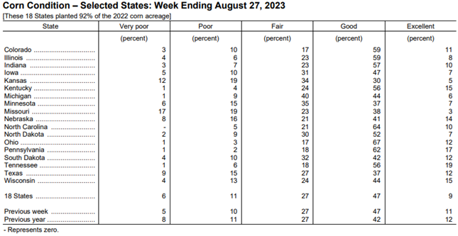 56% of Corn Crop rated as Good to Excellent Condition compared to 58% last week and 54% last year...