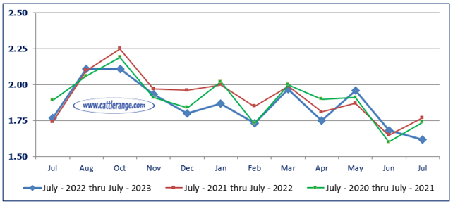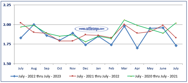 Marketings of fed cattle during July totaled 1.73 million head, 5 percent below 2022.