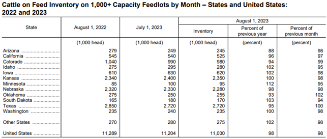 Cattle and calves on feed for the slaughter market in the United States for feedlots with capacity of 1,000 or more head totaled 11.0 million head on August 1, 2023. The inventory was 2 percent below August 1, 2022.