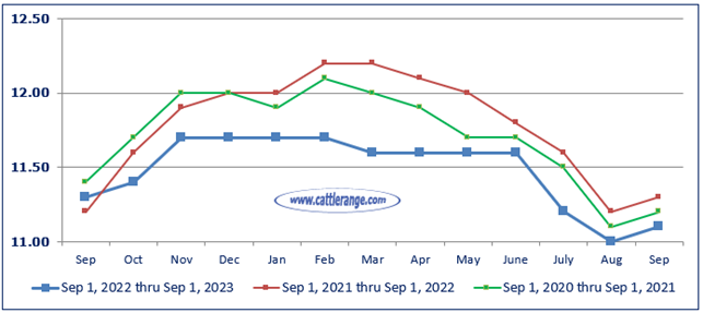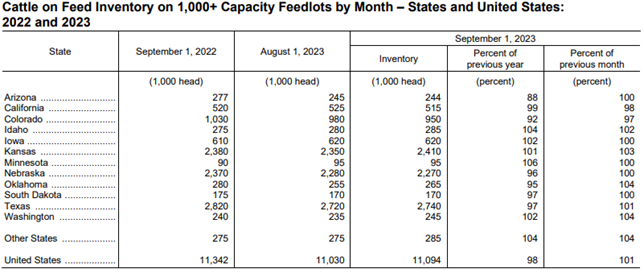 Cattle and calves on feed for the slaughter market in the United States for feedlots with capacity of 1,000 or more head totaled 11.1 million head on September 1, 2023. The inventory was 2 percent below September 1, 2022.
