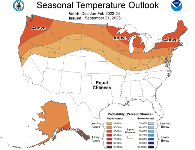 According to NOAA, the northern tier of the U.S. will likely experience above-average or well above-average temperatures from December through February.