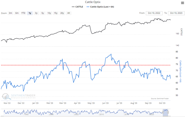 So when Public Opinion moves above the red dotted line in the chart, it means that compared to other readings over the past year, you're seeing excessive optimism. You also want to look at the absolute level of Opinion, too - if it's at 90%, then there's no question we're seeing an historic level of bullish opinion. Watch for readings above 80% (or especially 90%) to spot those dangerous times when the public is overly enthusiastic about a commodity.