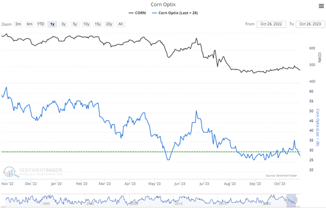 Conversely, when Public Opinion moves below the green dotted line, then the public is excessively pessimistic about the commodity's prospects for further gains compared to their opinion over the past year. Looking for absolute readings under 20% (or especially 10%) often indicates an upturn in the market.