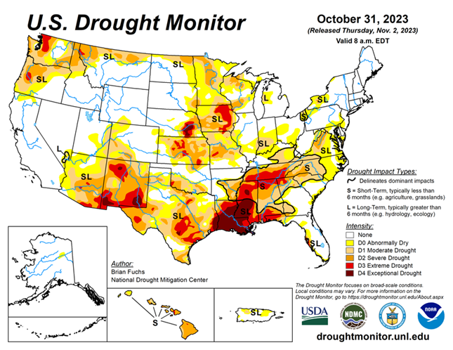 This week saw major improvements for almost every state in the Plains and Midwest. In contrast, every state in the Southeast saw drought develop and/or worsen. As of October 31, 2023, 30.68% of the U.S. and Puerto Rico and 36.53% of the lower 48 states are in drought, according to the U.S. Drought Monitor.