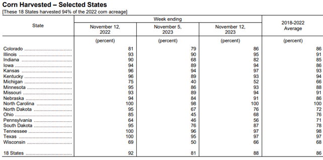 88% of Corn Crop harvested compared to 81% last week, 92% last year, and the 5-Year Average of 86%...