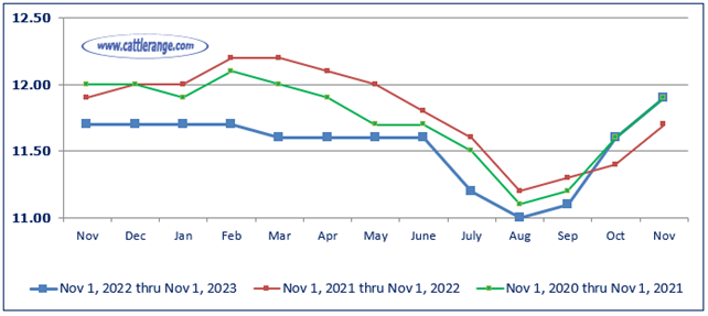 Cattle and calves on feed for the slaughter market in the United States for feedlots with capacity of 1,000 or more head totaled 11.9 million head on November 1, 2023. The inventory was 2 percent above November 1, 2022.