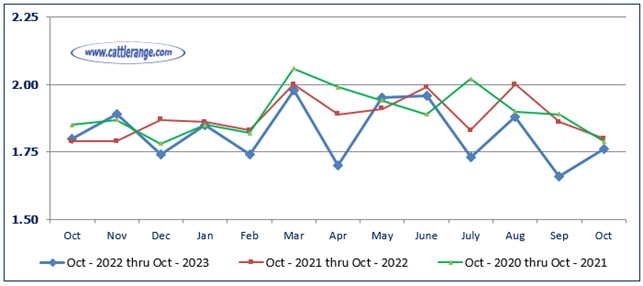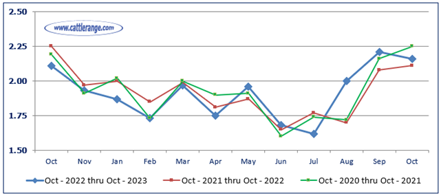 Marketings of fed cattle during October totaled 1.76 million head, 3 percent below 2022.