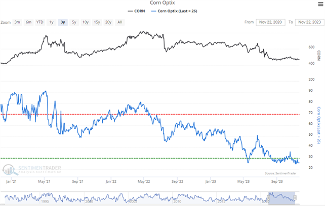 Conversely, when Public Opinion moves below the green dotted line, then the public is excessively pessimistic about the commodity's prospects for further gains compared to their opinion over the past year. Looking for absolute readings under 20% (or especially 10%) often indicates an upturn in the market.