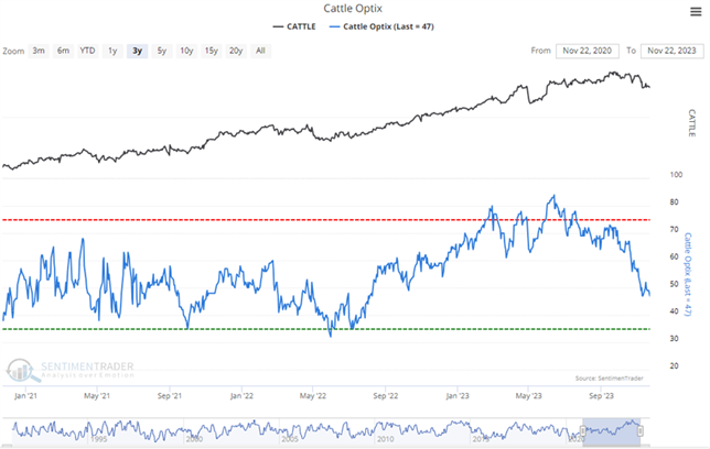 So when Public Opinion moves above the red dotted line in the chart, it means that compared to other readings over the past year, you're seeing excessive optimism. You also want to look at the absolute level of Opinion, too - if it's at 90%, then there's no question we're seeing an historic level of bullish opinion. Watch for readings above 80% (or especially 90%) to spot those dangerous times when the public is overly enthusiastic about a commodity.
