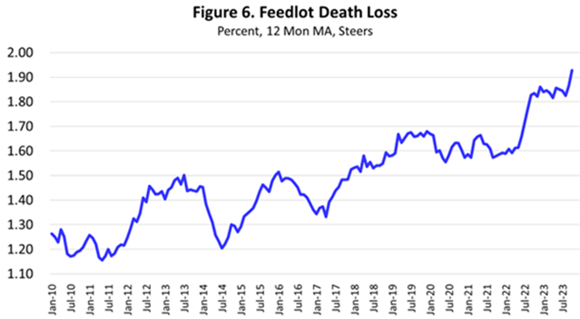 Figure 6 shows the concerning trend of higher feedlot death loss over time. The most recent twelve-month average steer death loss rate is 1.93 percent, up 56 percent from the 2010 level.