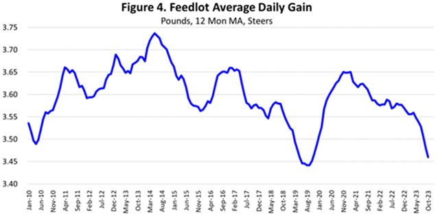 Figure 4 shows that average animal performance is quite variable over time. Average daily gain (ADG) is very seasonal and is impacted by weather, placement weight, feed markets, and cattle cycles, in addition to long-term trends. Feedlot ADG appears to have generally decreased since the peak in 2014. Most relevant to the current situation is the sharp drop in average daily gain in the past twelve months. Since late 2022, the twelve-month moving average of ADG has decreased by 3.4 percent to a current level of 3.46 pounds per day.