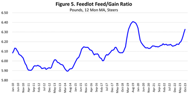 The feed/gain ratio, along with ADG, are the two most important economic indicators of feedlot profitability. Figure 5 shows that feed efficiency in feedlots has declined over time with the feed/gain ratio trending higher. Feedlot feed efficiency is impacted by the same list of short and long-term factors that affect ADG. The average feed/gain ratio has increased sharply in the past year with the current feed/gain ratio at 6.33, up 2.8 percent from one year ago.