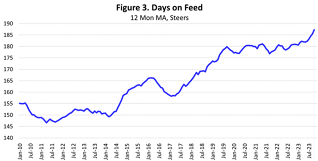 Feedlot cattle achieve more total gain now than before due to increased days on feed. Figure 3 shows that average days on feed has increased significantly in recent years to a current average of 187 days, up by 39 days from 2010. More days on feed means that the resulting feedlot turnover rate has decreased from 2.46 in 2010 to 1.95 currently. This means that feedlots can now finish slightly less than two sets of steers per year, or in other words, feedlots can maintain feedlot capacity while producing less animals per year.