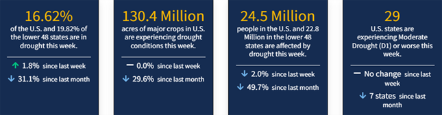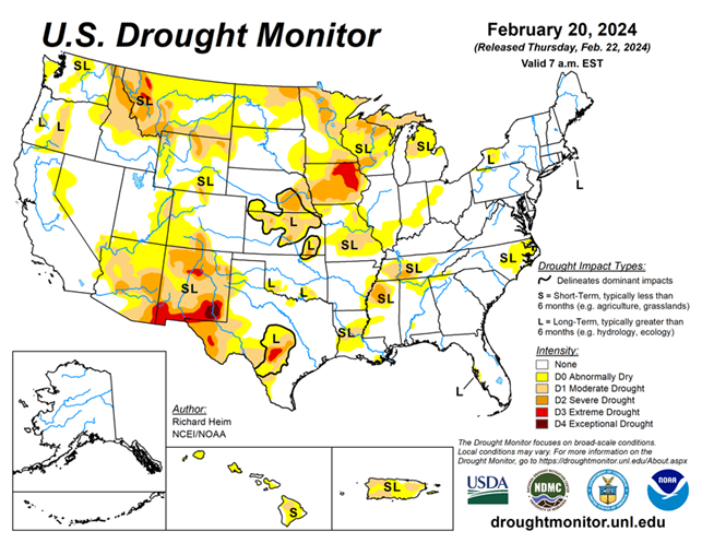 As of February 20, 2024, 16.62% of the U.S. and Puerto Rico and 19.82% of the lower 48 states are in drought, according to the U.S. Drought Monitor.