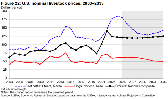 "Nominal prices for all animals and animal products initially come down from recent record or near record levels in 2022, 2023, or 2024. Most prices decline during the majority of the projection period with the exception of eggs, milk, and broilers."