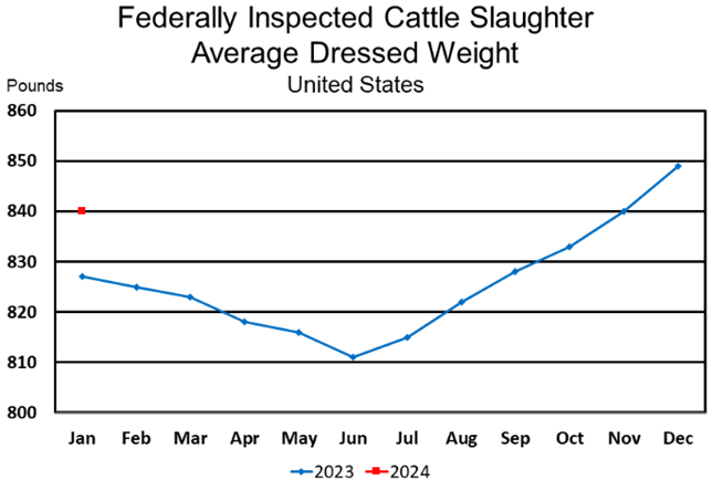 Beef production, at 2.28 billion pounds, was 2 percent below the previous year. Cattle slaughter totaled 2.73 million head, down 3 percent from January 2023. The average live weight was up 9 pounds from the previous year, at 1,389 pounds.