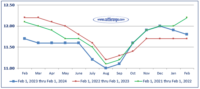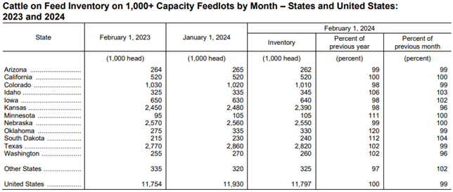 Cattle and calves on feed for the slaughter market in the United States for feedlots with capacity of 1,000 or more head totaled 11.8 million head on February 1, 2024. The inventory was slightly above February 1, 2023.
