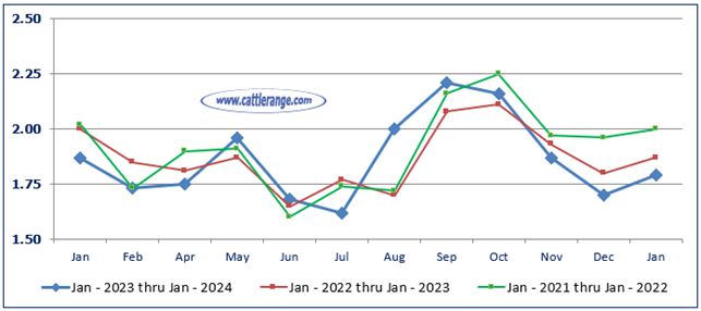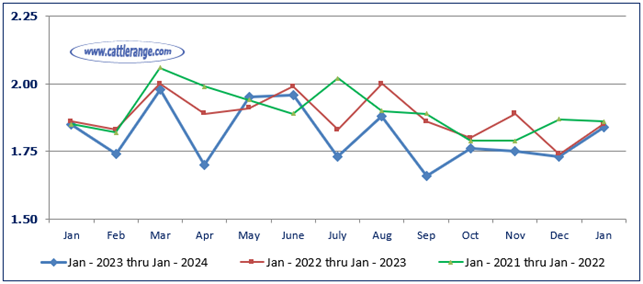 Marketings of fed cattle during January totaled 1.84 million head, slightly below 2023.