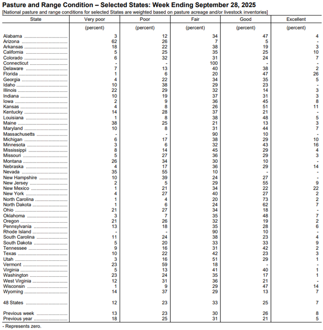 32% of Pasture & Range Conditions rated 'Good to Excellent' compared to 34% Last Week and 26% Last Year.