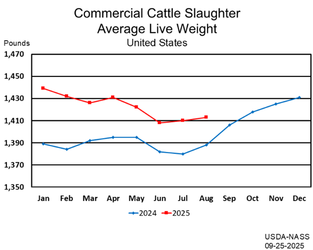 Beef production, at 2.02 billion pounds, was 12 percent below the previous year. Cattle slaughter totaled 2.33 million head, down 14 percent from August 2024. The average live weight was up 25 pounds from the previous year, at 1,413 pounds.
