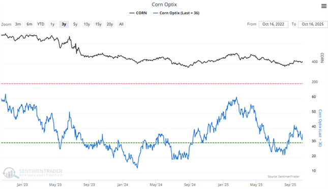 Corn - 3 Year Chart... Blue line tracks 'Market Sentiment'