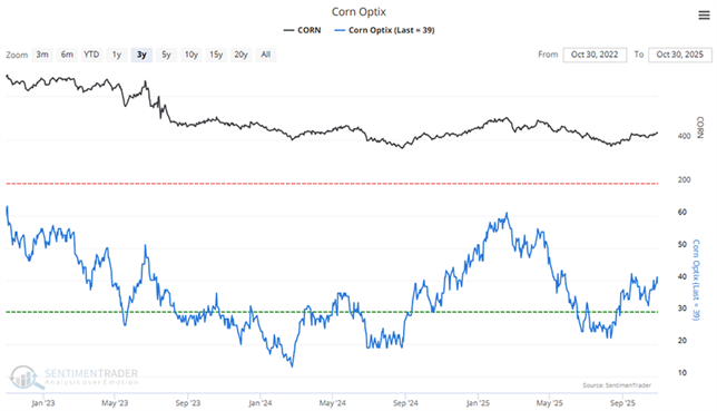 Corn - 3 Year Chart... Blue line tracks 'Market Sentiment'
