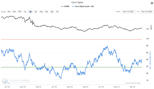 Corn - 3 Year Chart... Blue line tracks 'Market Sentiment'