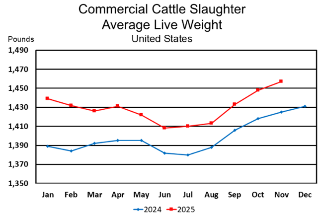 Commercial red meat production for the United States totaled 4.26 billion pounds in November, down 7 percent from the 4.56 billion pounds produced in November 2024. Beef production, at 2.02 billion pounds, was 9 percent below the previous year. Cattle slaughter totaled 2.27 million head, down 11 percent from November 2024. The average live weight was up 32 pounds from the previous year, at 1,457 pounds.