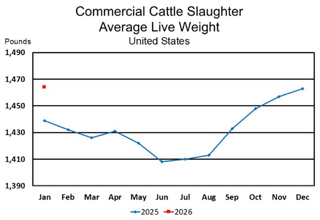 Beef production, at 2.12 billion pounds, was 11 percent below the previous year. Cattle slaughter totaled 2.38 million head, down 12 percent from January 2025. The average live weight was up 25 pounds from the previous year, at 1,464 pounds.