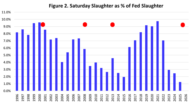 Low Saturday slaughter rates since 2023 show the impact of current low cattle inventories on the packing sector. The 2025 Saturday slaughter rate of 1.2 percent is the lowest in the past thirty years. The recent plant closure and reduction by Tyson will provide some relief in 2026. With cattle inventories unlikely to grow much, if any, in the next couple of years, it is not clear whether additional packing sector adjustments will be needed.